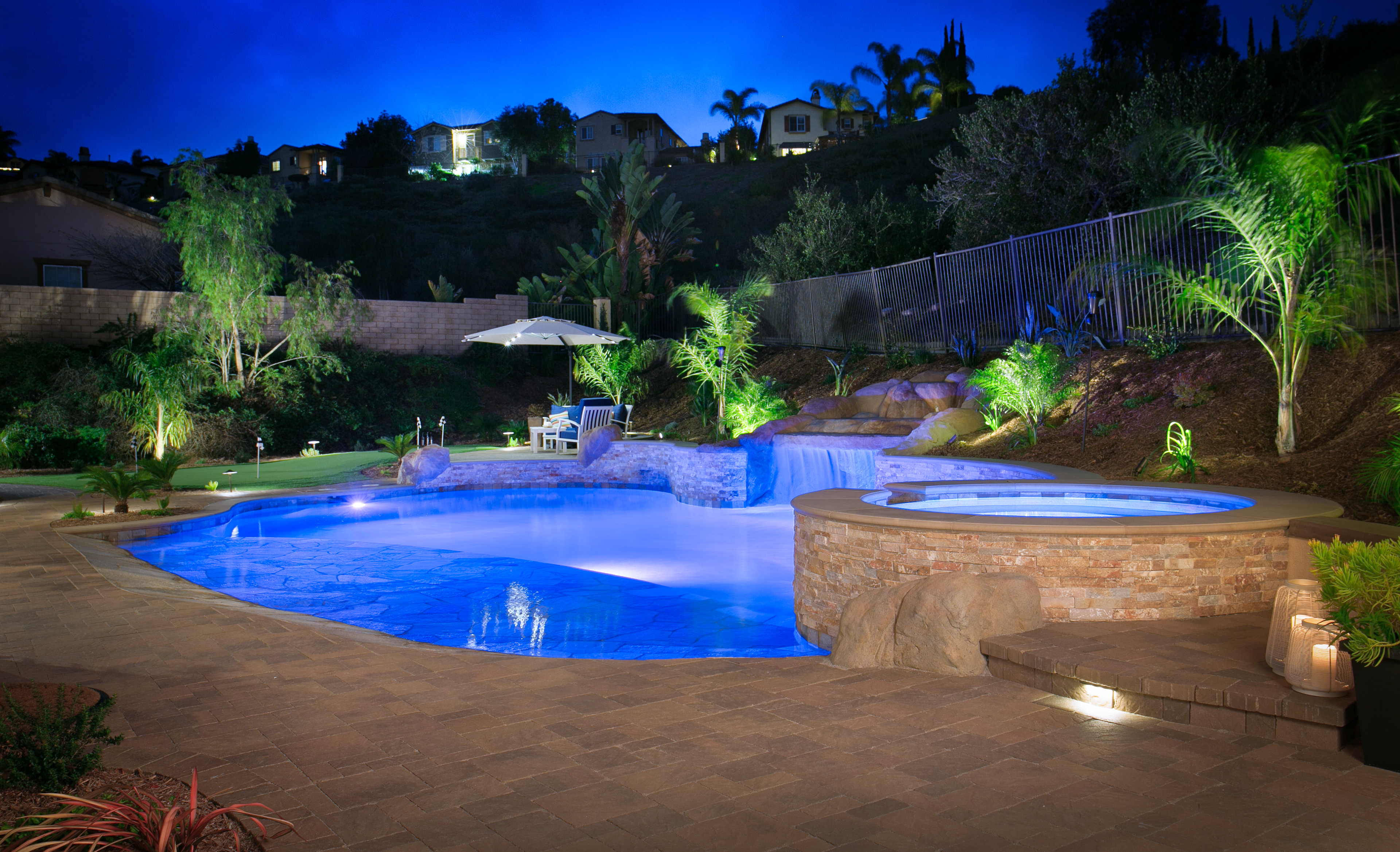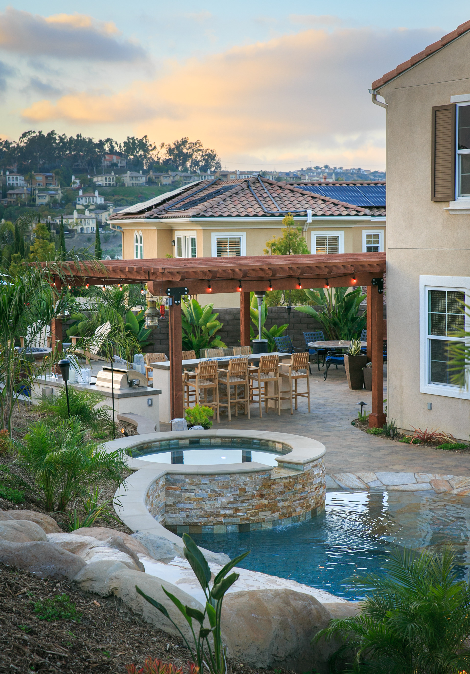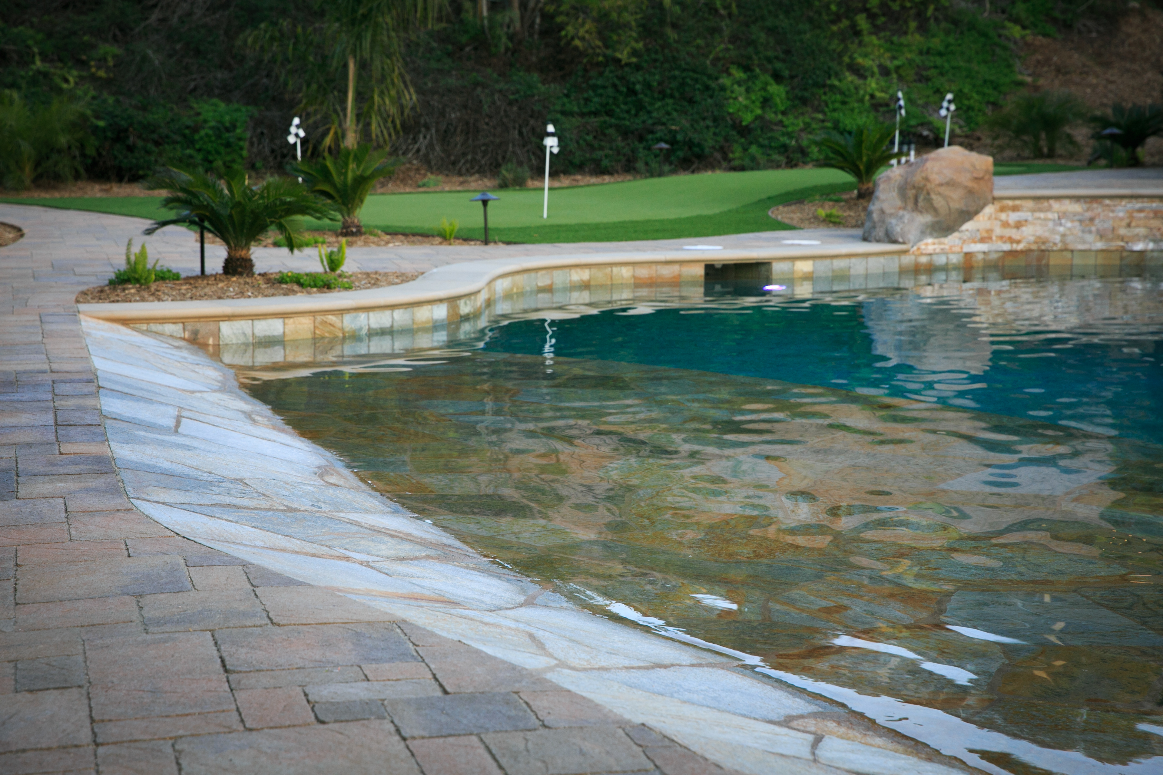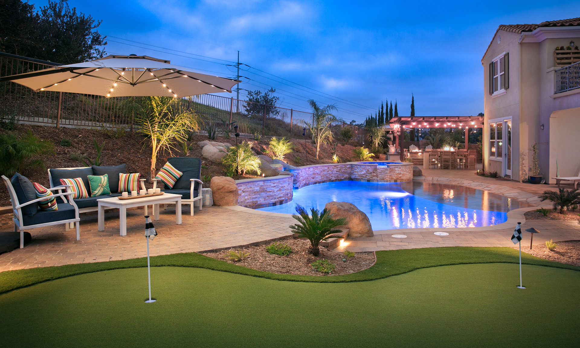 This backyard renovation includes a new pool with a beach entry and grotto, a putting green, raised fire pit patio and awesome outdoor kitchen and seating area, perfect for entertaining.