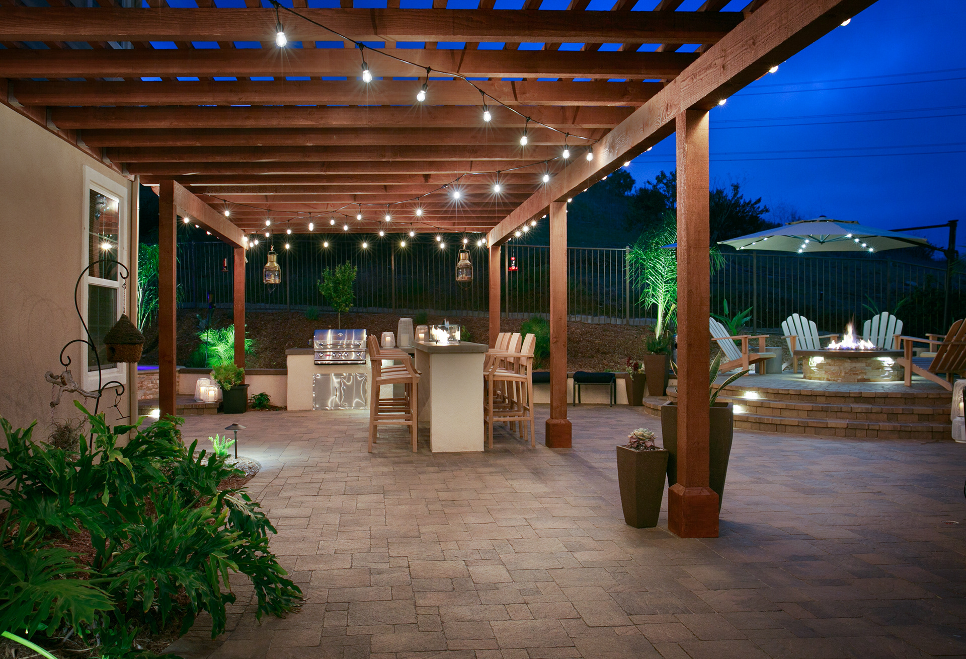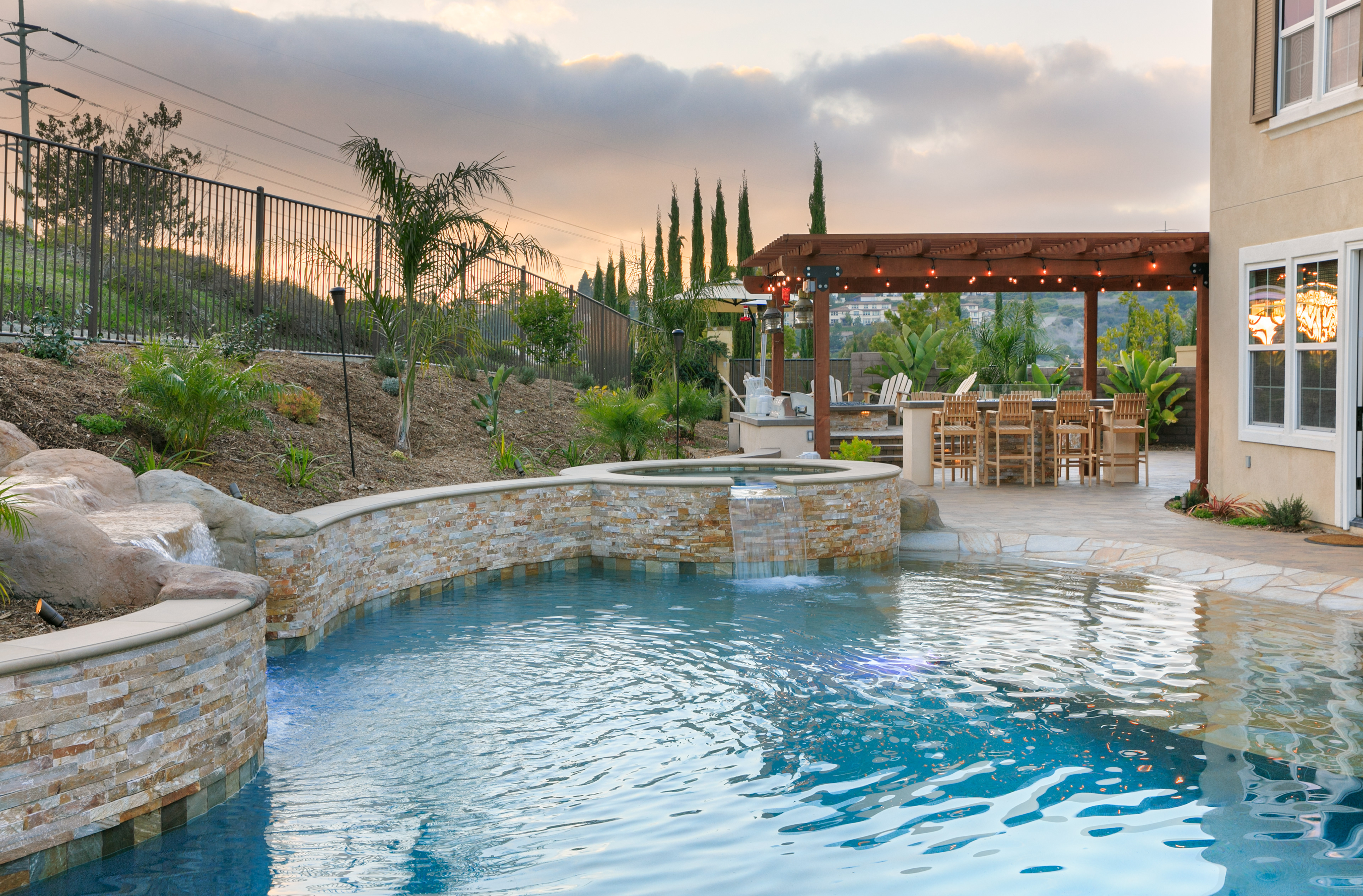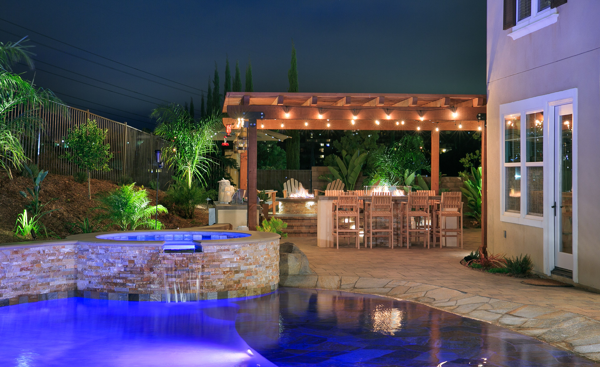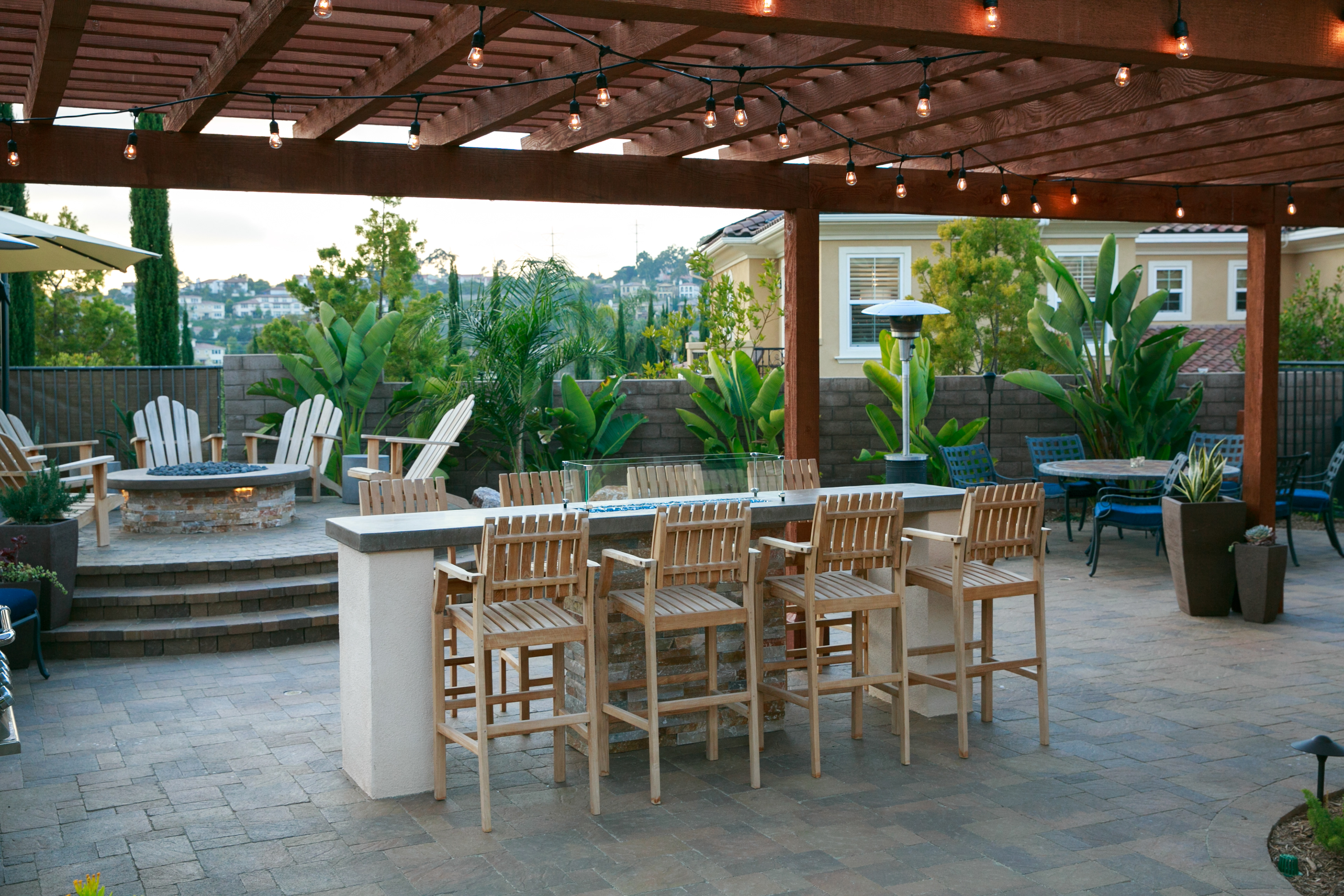 This backyard renovation includes a new pool with a beach entry and grotto, a putting green, raised fire pit patio and awesome outdoor kitchen and seating area, perfect for entertaining.