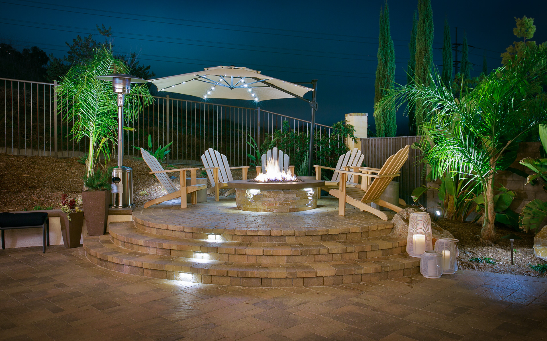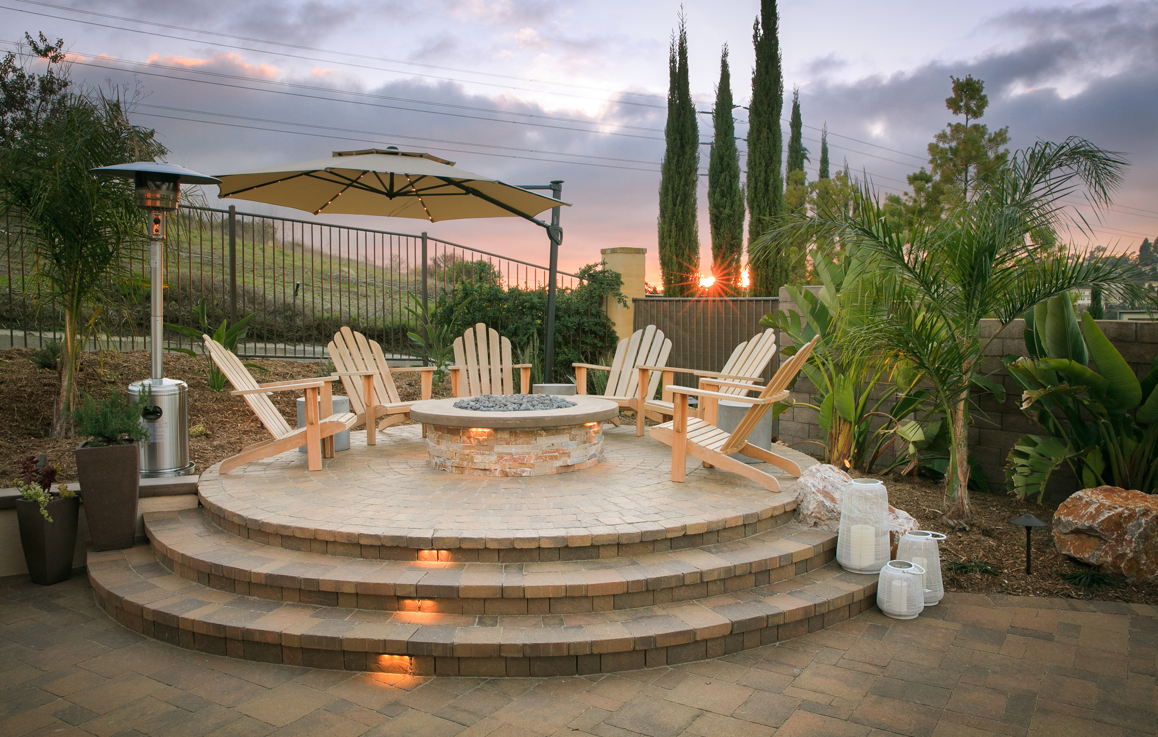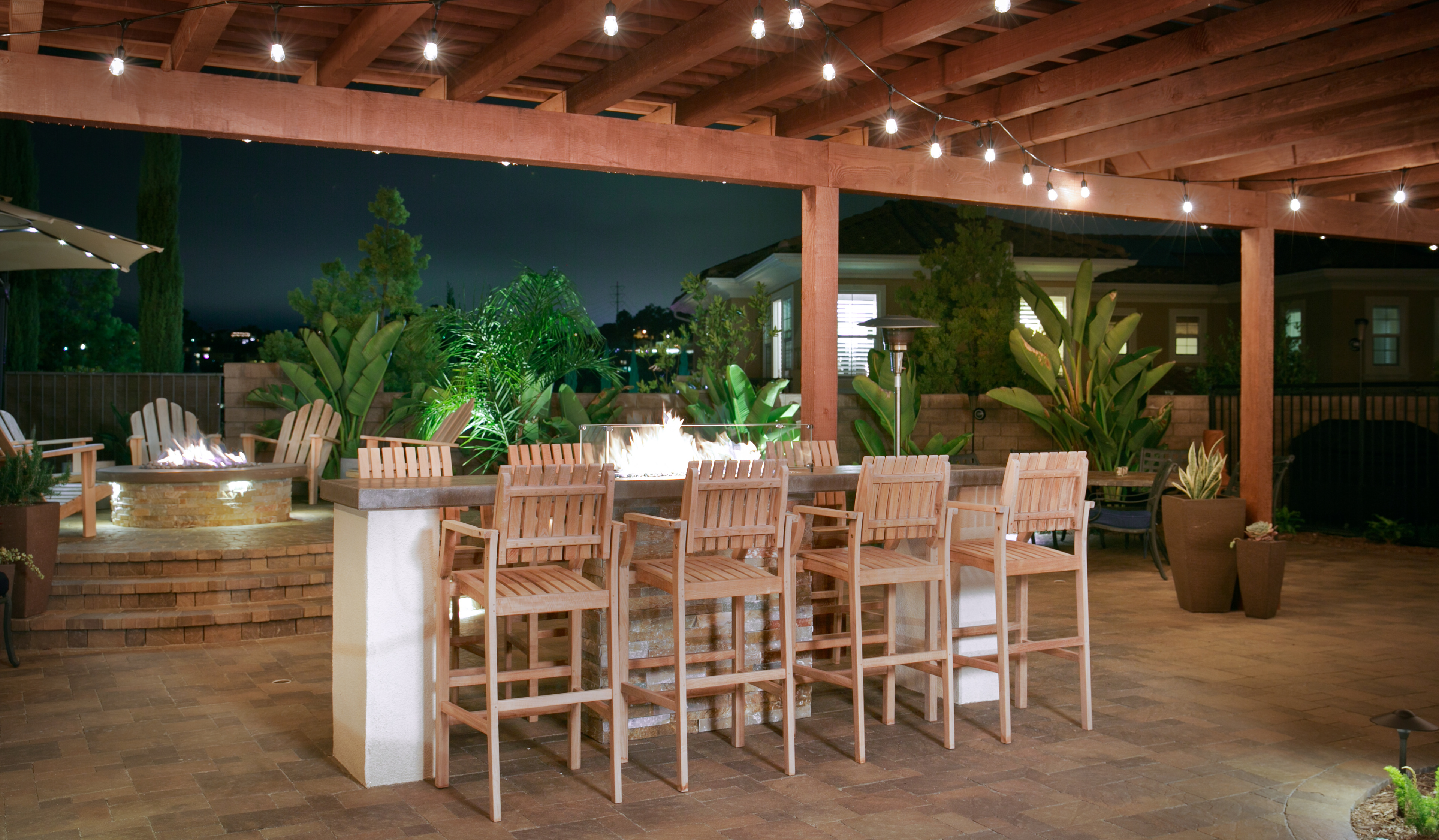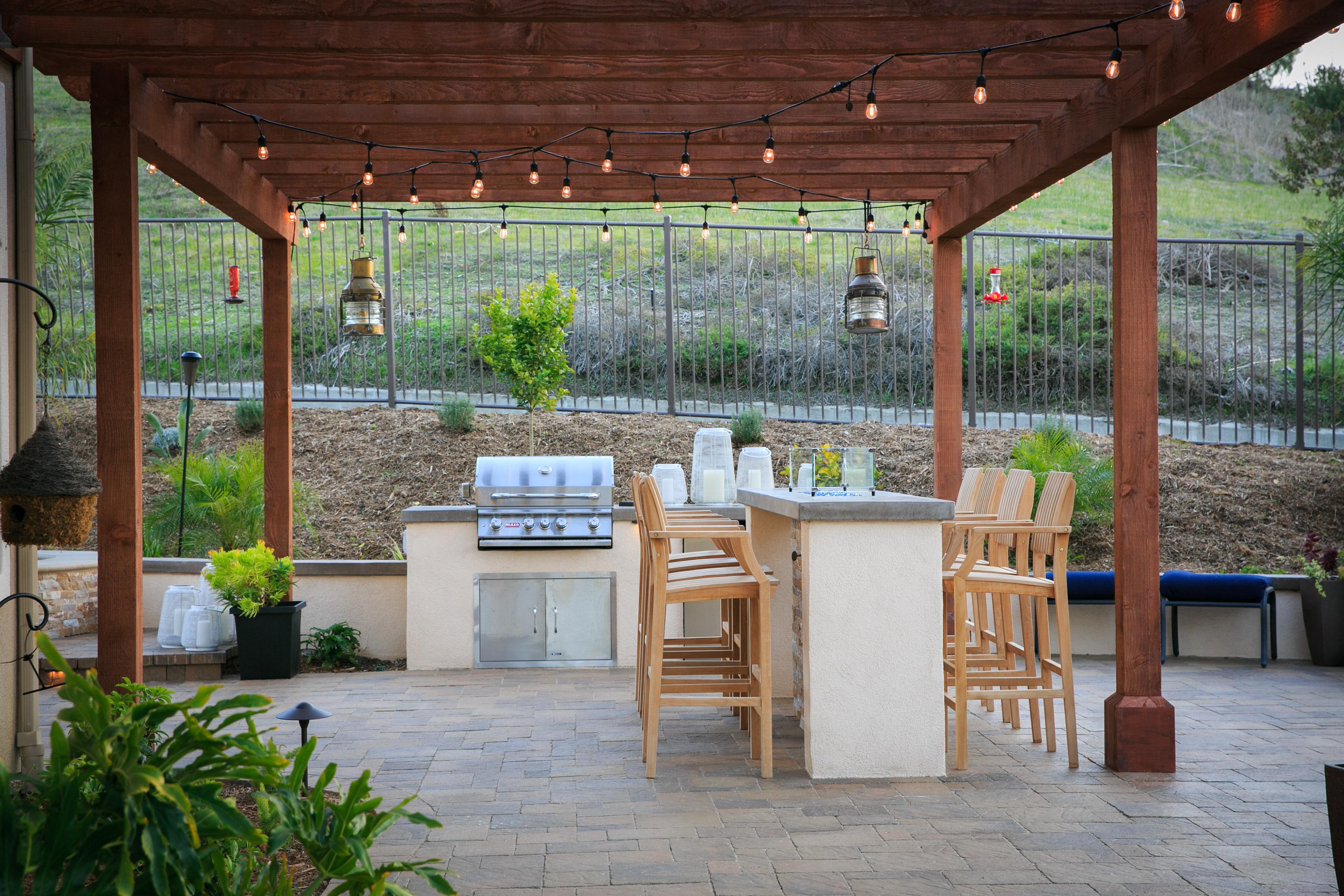 This backyard renovation includes a new pool with a beach entry and grotto, a putting green, raised fire pit patio and awesome outdoor kitchen and seating area, perfect for entertaining.