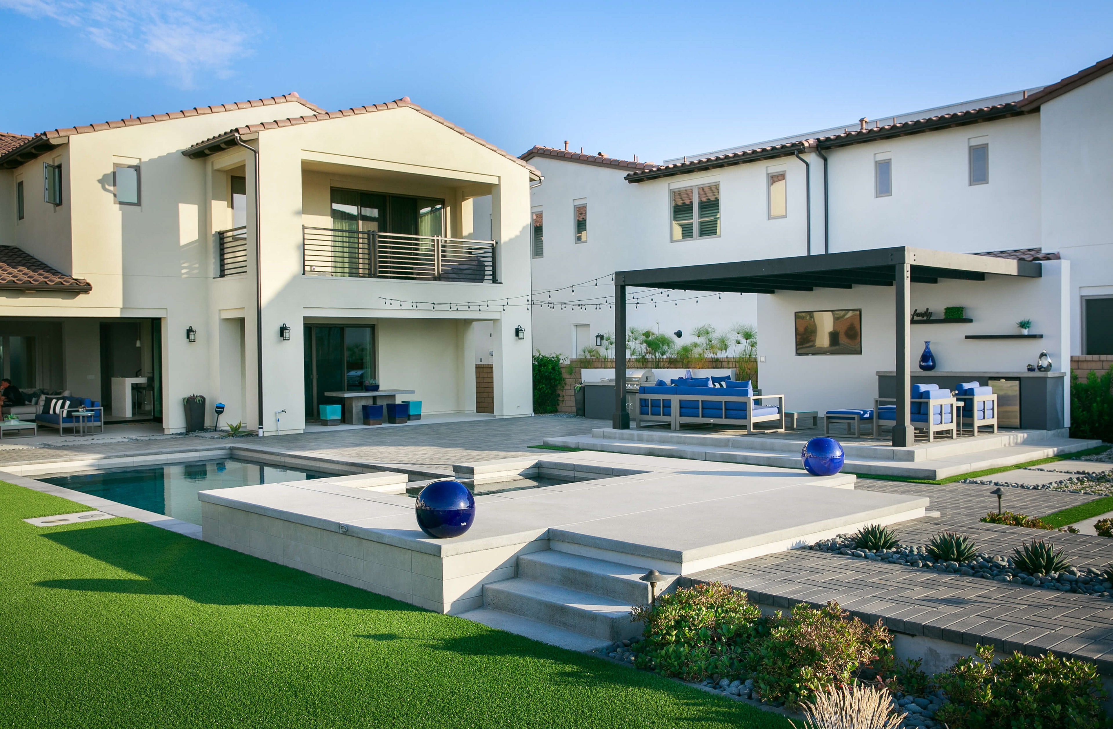 Welcome to the ultimate backyard, where the interior effortlessly merges with the exterior through wide panoramic glass doors, and where material transitions are subtly concealed. Centered in this vast space is a sizable pool complemented by a water wall, making it the centerpiece of the area. Designed for entertainment and enjoyment, this space features a spacious outdoor kitchen, a covered area for watching TV by the pool, a bocce ball court with a custom horseshoe backstop, and as night falls, a snug fire pit ideally situated on the canyon's brink.